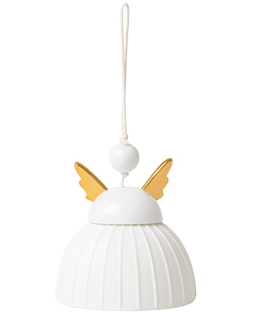 Schitterende hanger van Räder. Gemaakt van mat wit porselein met goudkleurig geverfde vleugels. Deze hanger bestaat uit 4 delen: De rok met reliëf strepen, het lijfje dat mat wit glad is en vleugels heeft, het kleine ronde hoofdje en onder de rok hangt een porseleinen klepeltje. Erg erg mooi! Deze gezellige hanger hang je aan een tak, een deurknop, een haakje of in een stevige kerstboom. Niet alleen mooi met kerst!