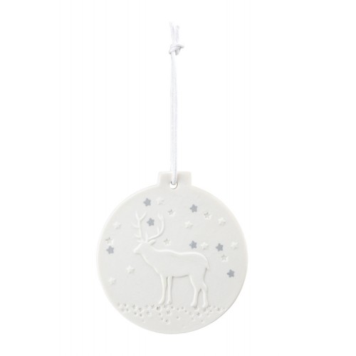 Prachtige ronde porseleinen hanger van Räder. De hanger heeft een reliëf van een rendier en het lijkt alsof er sneeuw om de rendier heen dwarrelt in de vorm van zilvergrijze stipjes en kleine sterretjes. De hanger is uiteraard erg leuk voor in de kerstboom, maar zal ook prachtig staan in/aan een krans, een tak, voor het raam of aan de knop van je kast.