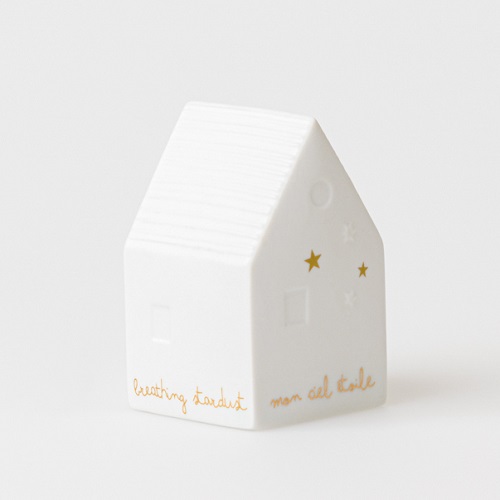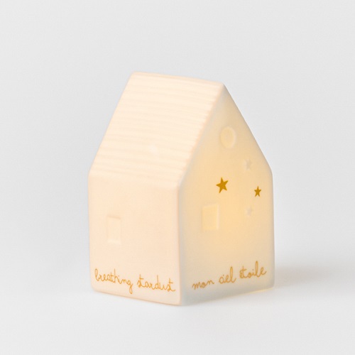 Erg mooi, klein porseleinen huisje van Räder. Het huisje is gemaakt van deels mat wit en deels geglazuurd porselein en heeft gestanste raampjes. Het dakje heeft streepjes en verdeeld over de zijkanten mat witte en mat gouden sterretjes. Aan de onderkant van het huisje is een kleine geglazuurde rand aangebracht met daarop 4 teksten, op elke kant 1 tekst: moment magique / breathing stardust / mon ciel étoilé / enter the dreamland. Het led lampje schijnt subtiel door het porselein. De led verlichting werkt op 3 LR44 batterijtjes (inclusief).