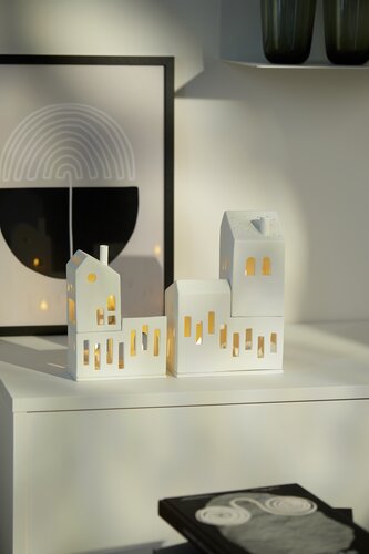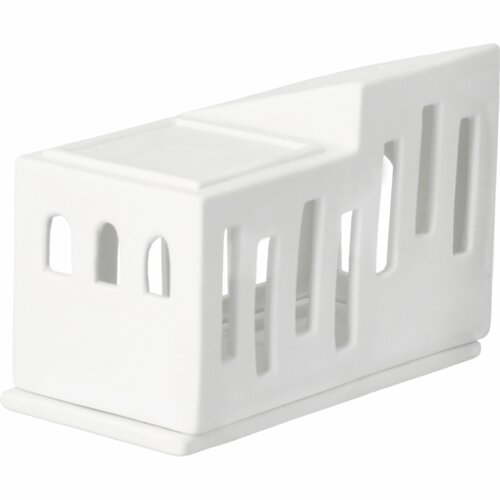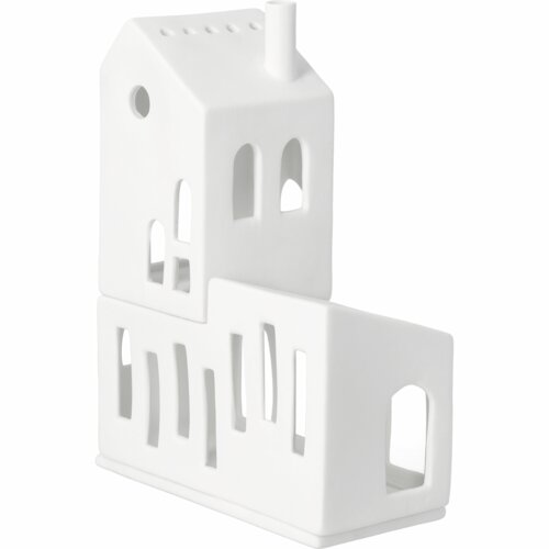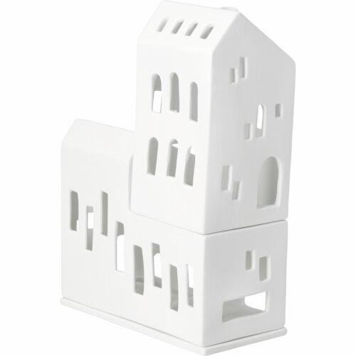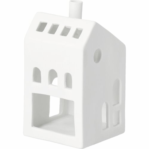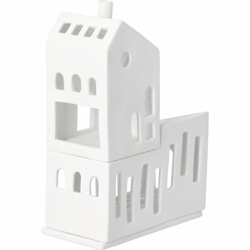 Dit is een heel bijzonder lichthuis van Räder. Het is gemaakt van mat wit porselein en bestaat uit 3 delen. De bodem, de eerste verdieping en het 'bijgebouw". Je kunt dit huisje stapelen, maar je kunt er ook voor kiezen het “bijgebouwtje” naast de het andere deel te zetten. Het huisje is geschikt voor een normaal formaat waxinelichtje. Houd je niet van echt vuur, dan kun je er ook heel goed een elektrisch lichtje of een lichtsnoertje doorheen halen. Gemakkelijk en geeft een prachtig effect. Dit huisje is supermooi in combinatie met alle andere huisjes van Raeder.
