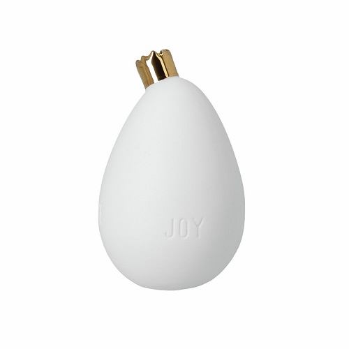 Dit is een te leuk porseleinen ei van Räder. Het is gemaakt van mat wit porselein, heeft een handbeschilderd goudkleurig kroontje en rondom subtiel de teksten: Joy, Love en Prosperity. Zet het eitje met wat haasjes op een mooie schaal of een plateau, kleed het aan met vrolijke bloemen en een schaaltje chocolade eitjes en jouw versiering is helemaal compleet. Prachtig!