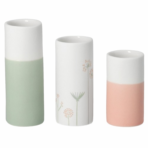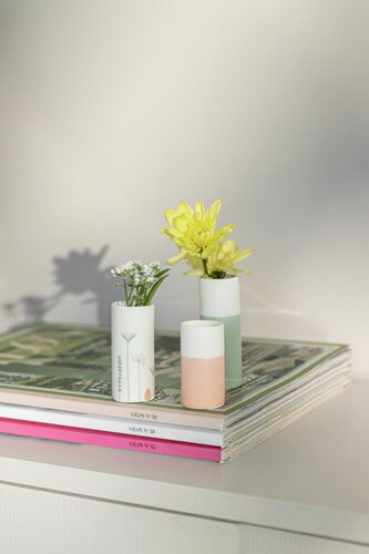 Prachtige kleine vaasjes set van Räder. De vaasjes zijn gemaakt van mat wit porselein en van binnen geglazuurd zodat je er water en echte bloemetjes in kunt zetten. Het grootste vaasje is wit met pastelgroen, het middelste vaasje is mat wit en heeft een subtiele print van lentebloemen. Het kleinste vaasje is wit met pastel zalmroze. Dit is echt een superleuke set voor op de Paastafel, maar is niet typisch Pasen. Zet het met bloemetjes op een schaal met haasjes en lekkers en je hebt een heerlijk vrolijk tafereel.