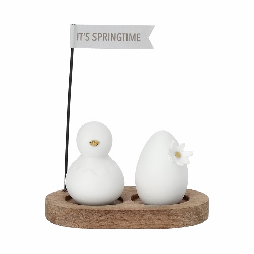 Wie gun jij deze schattige Lentegroet van Räder? Deze lieve groet is gemaakt van mat wit porselein met kleine handbeschilderde goudkleurige details. Het kuikentje en het eitje met bloemetje staan op een klein houten plateautje dat is voorzien van een vlaggetje. Op dit vlaggetje staat de groet It's Springtime. Dit delicate tafereeltje staat prachtig op een Paastafel, een Lenteschaal of gewoon op een mooi plekje op de kast. Maakt het af met een mooi vaasje met een enkele bloem.