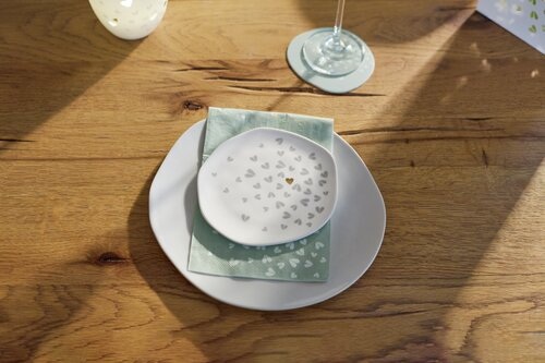 Allerliefst klein, organisch rond schaaltje van Räder. Dit schaaltje is gemaakt van wit porselein. Aan de bovenkant geglazuurd, aan de onderkant mat wit. De bovenkant is bezaaid met kleine grijze hartjes en 1 goudkleurig hartje. Perfect voor lekkere bonbonnetjes, sieraden, een ornamentje, stukje zeep of amberblokje. (niet in de vaatwasser).