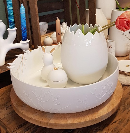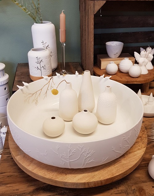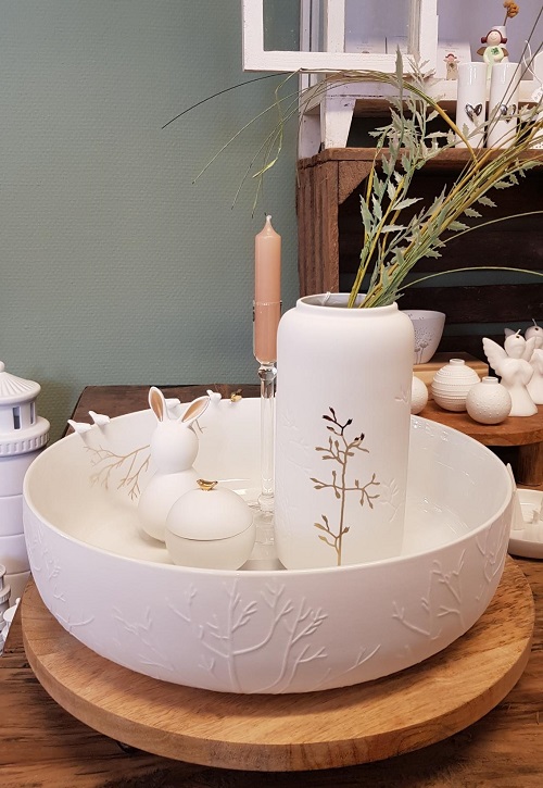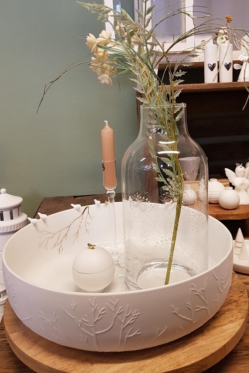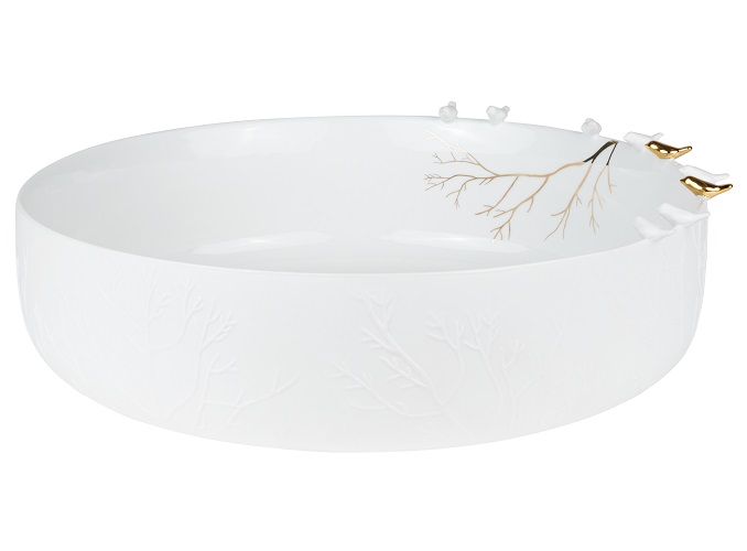 Fantastische schaal van Räder, gemaakt van mat wit porselein. Aan de binnenkant is de schaal geglazuurd waardoor er mega veel mogelijkheden zijn. Aan de binnenkant is de print van een tak aangebracht. De buitenkant van deze schaal is volledig bedekt met een reliëf van subtiele witte takken. Op de rand zitten 9 vogeltjes. Twee van deze vogeltjes zijn met echt goud handbeschilderd. De schaal heeft een mooie opstaande rand. Je kunt de schaal bijvoorbeeld vullen met mos, een vaasje met bloemen en een lichthuisje er bij. Of maak er een thema schaal van, elk seizoen iets anders. De schaal is eenvoudig schoon te maken met een zachte (vochtige) doek.