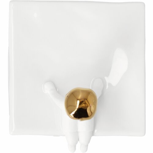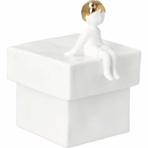 Lief porseleinen potje van Räder. Het potje is gemaakt van mat wit porselein aan de buitenkant met een kleine geglazuurde rand. De binnenkant is glanzend geglazuurd. Het deksel is van binnen en van buiten geglazuurd. Op het deksel zit een jongen te genieten. Deze jongen heeft handbeschilderd, goudkleurig haar.