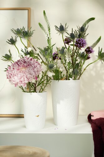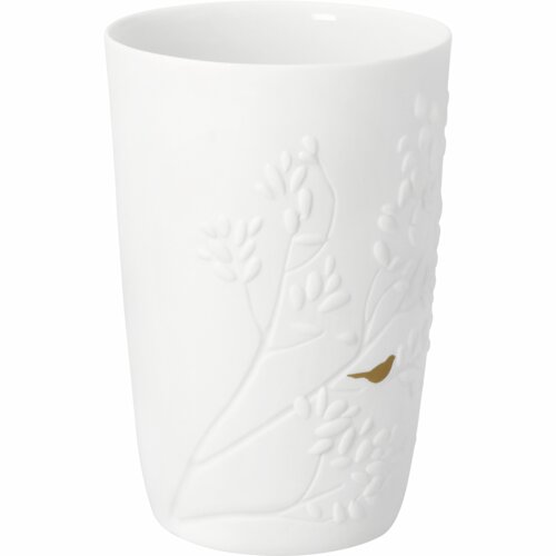 Prachtige vaas van Räder van mat wit porselein. Deze vaas heeft de afbeelding een gestanste boom met reliëf blaadjes waarin één klein mat goudkleurig vogeltje zit. De hele simpele vorm maakt dat je er van alles mee kunt doen. Een tak, een enkele bloem, een plantje of een mooi subtiel boeket, het staat allemaal mooi. De vaas loopt iets taps toe, dus aan de onderkant een beetje smaller dan de bovenkant. De binnenkant is geglazuurd, dus goed geschikt voor water.