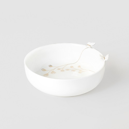 Prachtig schaaltje van Räder. Dit schaaltje is gemaakt van mat wit porselein. De binnenkant is geglazuurd en versierd met een goudkleurige takjes print. Bovenop het schaaltje zijn twee kleine vlindertjes aangebracht met een hele klein glanzend goudkleurig detail. Het schaaltje is heel geschikt voor sieraden, decoratie van het seizoen of iets lekkers.