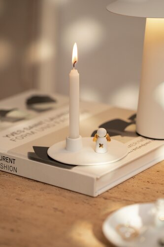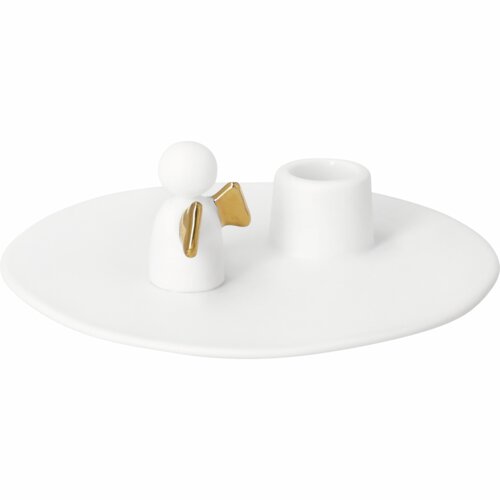 Te schattig klein kaarsenstandertje van Räder. Gemaakt van mat wit porselein, organisch rond en voorzien van een klein engeltje. Dit engeltje heeft op de voorkant een drup glazuur waarop met de hand een goudkleurig hartje is geschilderd. Dit kaarsenstandertje is geschikt voor kaarsjes met een diameter van 1,2 cm (artikelnummer 89792). Een kleine boodschapper van geluk.