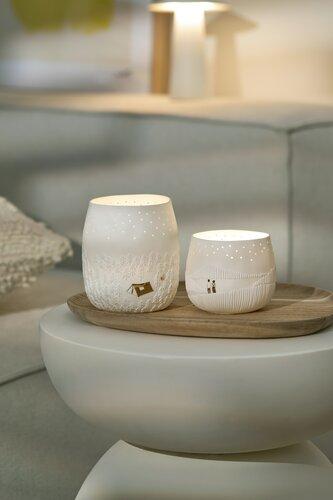 Dit prachtige nieuwe waxinelichtje van Räder is een sprookje! Het is gemaakt van matwit porselein in reliëf dat een glooiend landschap voorstelt. Het lichtje is bezaaid met mooie, kleine sterretjes, de maan en een figuurtje. Het houdertje kan ook heel goed als potje gebruikt worden, want van binnen is het geglazuurd. Voor je liefste kleine plantje bijvoorbeeld.