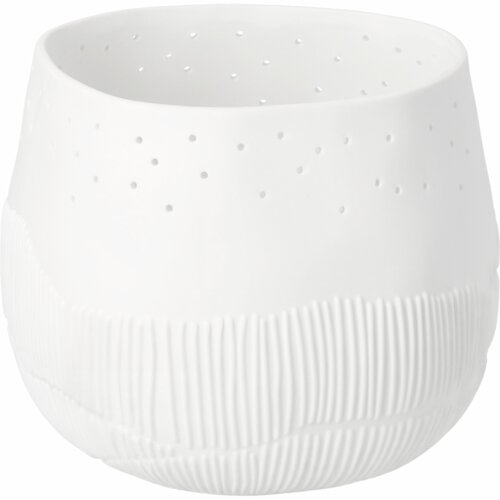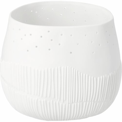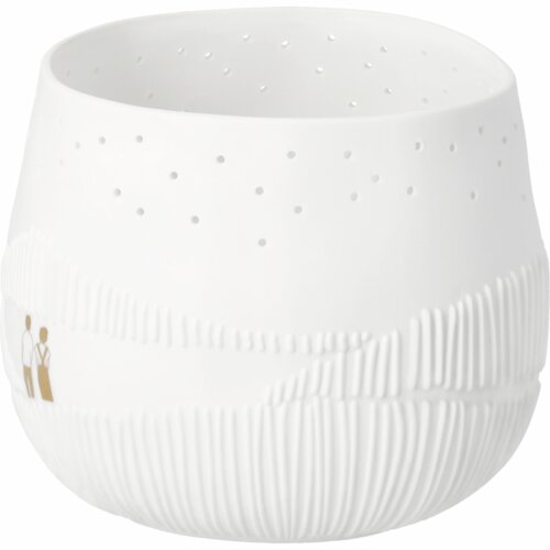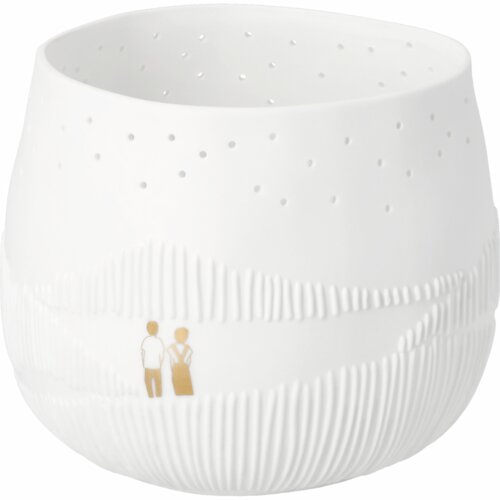 Sprookjesachtige serie van Räder: Walk in the park. Dit waxinelicht is ook weer zo'n topstuk van Räder. Het heeft een licht organische vorm en is gemaakt van glad mat wit porselein. Räder heeft deze waxinelichthouder versierd met een reliëf print van strepen die struiken en planten in de heuvels voorstellen. Op de voorkant staan twee figuurtjes te genieten van de omgeving en de sterrenhemel. Deze figuurtjes zijn is voorzien van een klein beetje glazuur waarop goudverf is aangebracht. Aan de bovenkant van het waxinelicht zitten gaatjes waar het licht heel subtiel doorheen schijnt.