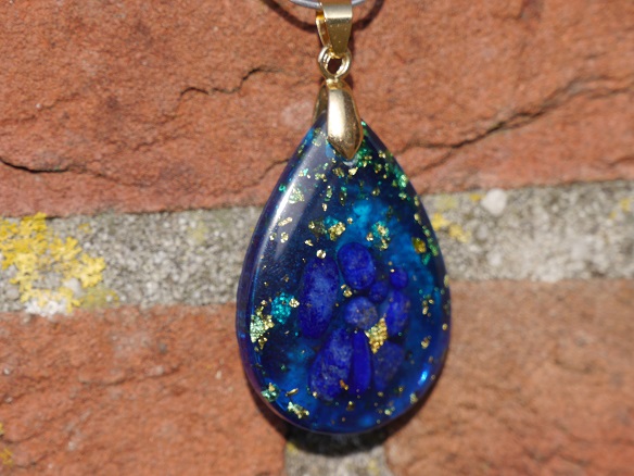 Deze Blue Ocean Drop bestaat uit Lapis Lazuli en 24K bladgoud. Lengte is ca 4 cm. De hanger heeft een goudkleur roestvrij stalen hangoogje en wordt geleverd met een koord.