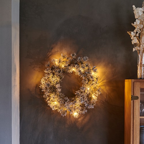 Schitterende kerstkrans van Sirius. Deze krans is grijzig-groen en is voorzien van een laagje sneeuw. De krans heeft 15 led lampjes die een warm wit licht geven. De boom werkt op 3 AA batterijen (exclusief), waardoor je hem op allerlei plaatsen kunt hangen. Doordat deze krans heerlijk neutraal is, kun je hem versieren zoals je zelf wilt. Een enkele hanger, bonte kleuren of subtiel, pas hem aan aan je eigen interieur.