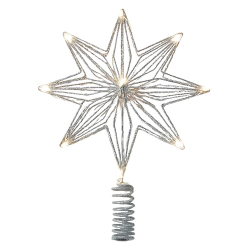Schitterende piek voor in de kerstboom van Sirius. Deze topper is gemaakt van glitter metaal en is voorzien van 10 warm witte ledlampjes. De onderkant van de piek is een spiraal die je over de top van de kerstboom zet. Aan de piek zit een snoertje met een koker waarin de batterijen zijn verwerkt. De koker heeft een aan en uit knopje.