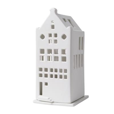 Prachtige, sfeervolle keramieken waxinelichthouder in de vorm van een karakteristiek grachtenpandje. Dit huisje heeft een klokgevel en is mat wit geglazuurd. Maak je mooie, speciale eigen straatje met lichtgevende grachtenpandjes in je woonkamer. Een aantal gelijke soorten is leuk, maar durf jij te combineren met verschillende geveltjes en kleuren?  Het lijkt dan bijna of je op een donkere avond door de straten van Amsterdam loopt! Ook een ideaal cadeautje voor de feest- en verjaardagen.