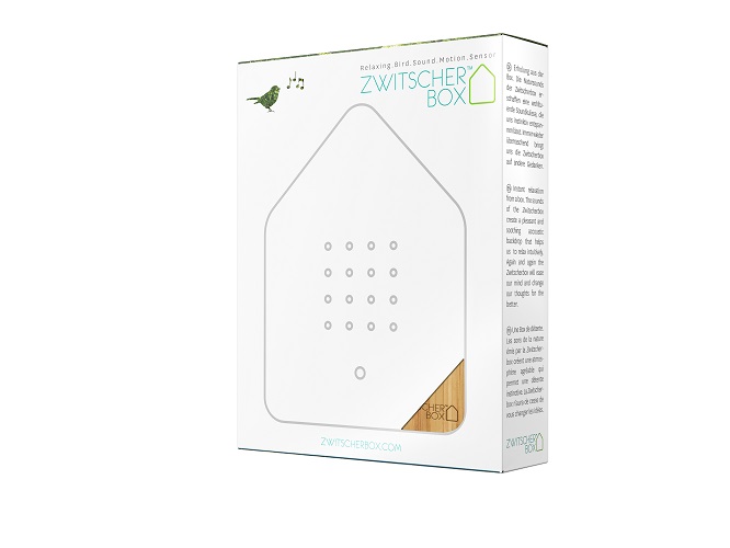 Zwitscherbox Wood vogelhuisje met bewegingssensor. De natuurlijke geluiden van de Zwitscherbox creëren een rustgevend soundscape waarmee we intuïtief kunnen ontspannen. We voelen ons frisser, gemotiveerd en ontspannen en dat maakt ons vriendelijk en gelukkig. Buitengewoon rustgevend voor huis of kantoor, hilarisch op bijvoorbeeld het toilet.